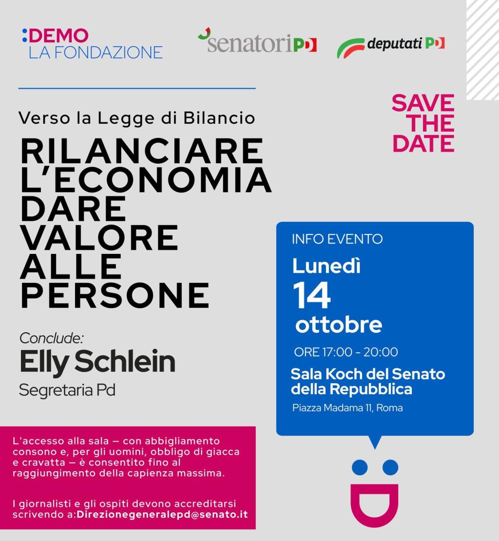 On Monday, October 14, the Koch Hall of the Italian Senate will host an event dedicated to “Relaunching the Economy, Giving Value to People,” organised by the Fondazione Demo in collaboration with the Democratic Party Chamber and Senate Groups. PD Secretary Elly Schlein will close the event.