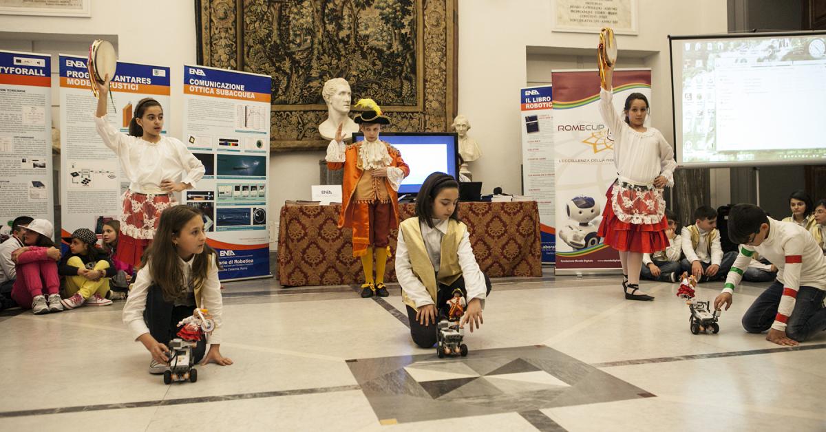 The event includes the presentation of the Trinity certificates, an exhibition of the robots built and programmed by the students and a show by the students and teams that participated in RomeCup2014. Team “Funiculì Funiculà” won the Dance Primary category.