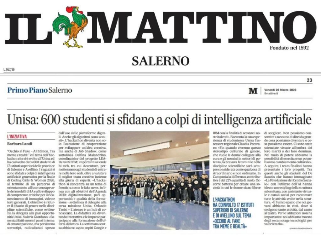 “Occhio al fake! Tra meme e realtà”: distinguere il vero dal generato e immaginare il futuro dei territori con l’intelligenza artificiale. È questa la sfida al centro del primo hackathon Coding Girls & Women realizzato presso il Dipartimento di Informatica dell’Università degli Studi di Salerno, che ha coinvolto 574 partecipanti, 141 team, 17 istituti scolastici e una comunità educante composta da docenti, università e volontari.