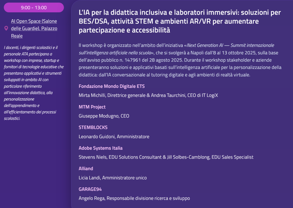 Nel workshop “Strumenti e pratiche per la personalizzazione della didattica: dall’IA conversazionale al tutoring digitale e alla realtà virtuale” (sabato 11 ottobre, ore 9–13, AI Open Space, Palazzo Reale), Mirta Michilli, direttrice generale della Fondazione, e Andrea Taurchini, ceo di IT LogiX, presentano Pathway Companion, una piattaforma di intelligenza artificiale dedicata al supporto dei bambini con Bisogni educativi speciali (BES).