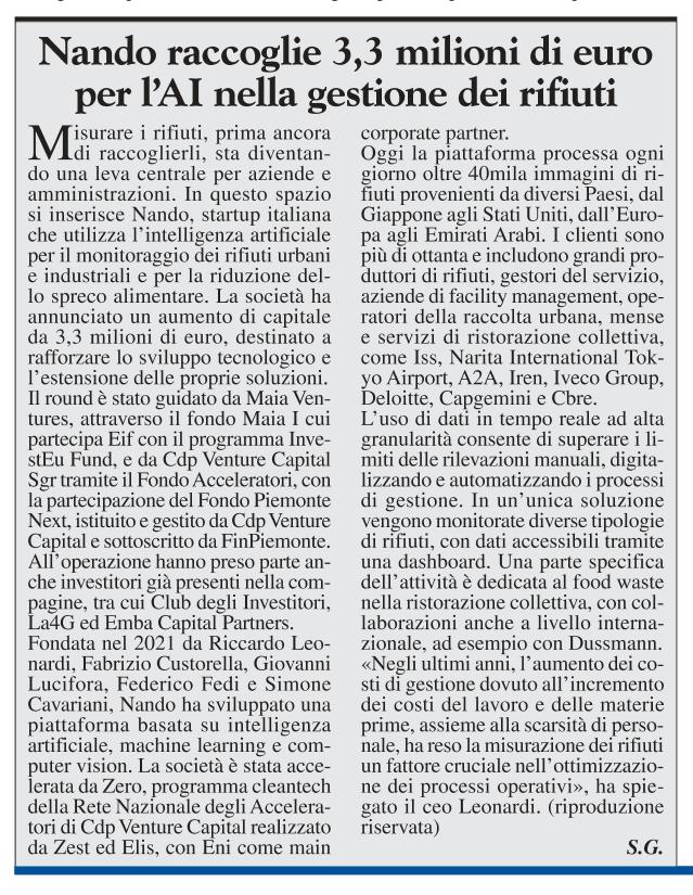 Nel 2026 la startup ha annunciato un aumento di capitale da 3,3 milioni di euro, guidato da Maia Ventures (attraverso il fondo Maia I con partecipazione EIF – InvestEU) e da Cdp Venture Capital tramite il Fondo Acceleratori, con il coinvolgimento di investitori già presenti nella compagine. I clienti sono oltre 80 e includono grandi produttori di rifiuti, gestori del servizio urbano, aziende di facility management e operatori della ristorazione collettiva. Come ha spiegato il ceo Riccardo Leonardi, la crescente pressione sui costi di gestione e la scarsità di personale rendono la misurazione dei rifiuti un fattore cruciale per l’ottimizzazione dei processi.