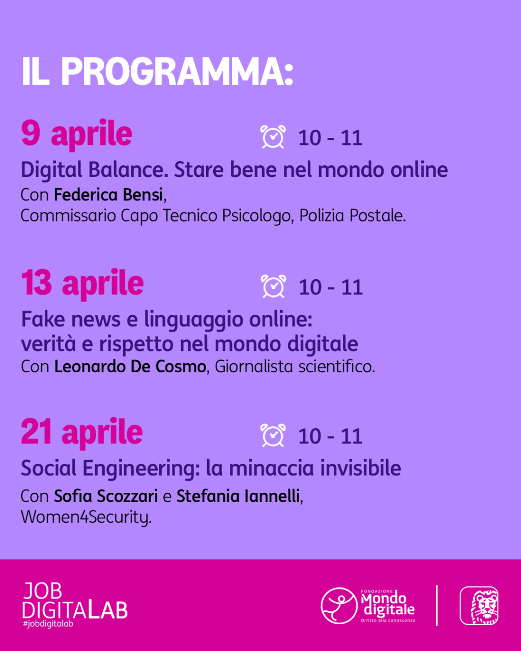 Con l’ultimo appuntamento del ciclo Consapevoli nel digitale, promosso nell’ambito di Job Digital Lab con ING Italia, si completa un percorso che ha coinvolto 22 classi e circa 450 studenti delle scuole secondarie di secondo grado in tutta Italia [vedi la notizia Benessere, informazione, sicurezza]. Dopo aver affrontato il tema del benessere digitale e quello dell’informazione online, il webinar conclusivo, in programma oggi martedì 21 aprile, sposta l’attenzione sulla sicurezza, chiudendo idealmente un itinerario formativo costruito attorno a tre dimensioni ormai inseparabili dell’esperienza digitale contemporanea: equilibrio nell’uso delle tecnologie, spirito critico nella fruizione dei contenuti e capacità di riconoscere rischi e minacce online.