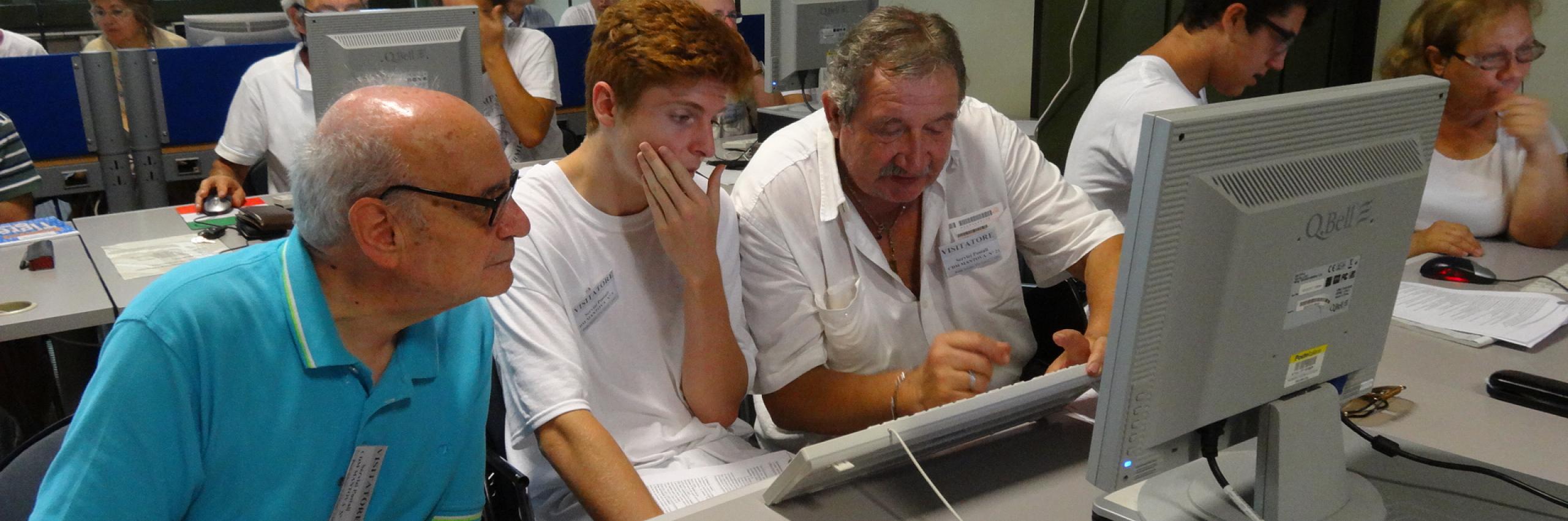 Oggi quinta lezione a Mantova. Nell’ufficio postale di via Pietro Nenni 2 gli over 60 trovano i tutor dell’IIS Enrico Fermi, diretto dalla preside Cristina Bonaglia. Coordinano i lavori in aula i docenti Paolo Pelizzoni e Massimiliano Ferro. I partecipanti, da 62 a 80 anni, sono quasi tutti principianti assoluti, per la prima volta di fronte a tastiera e mouse.