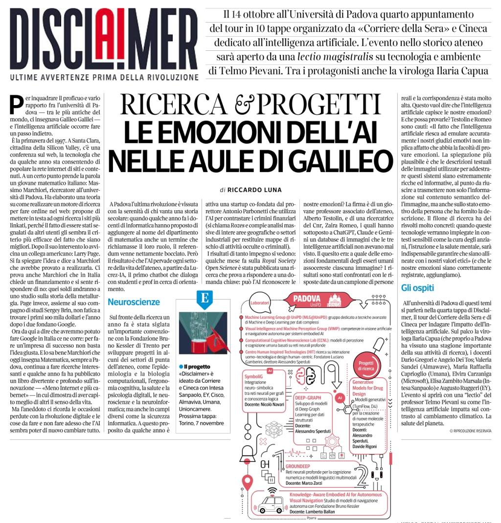 Oggi, martedì 14 ottobre 2025, fa tappa a Padova il tour nazionale DisclAImer. Ultime avvertenze prima della rivoluzione, promosso dal Corriere della Sera in collaborazione con Cineca e coordinato da Riccardo Luna, editorialista ed esperto di innovazione. La Fondazione Mondo Digitale partecipa come knowledge partner, portando esperienze e strumenti per un uso etico, inclusivo e formativo dell’intelligenza artificiale.