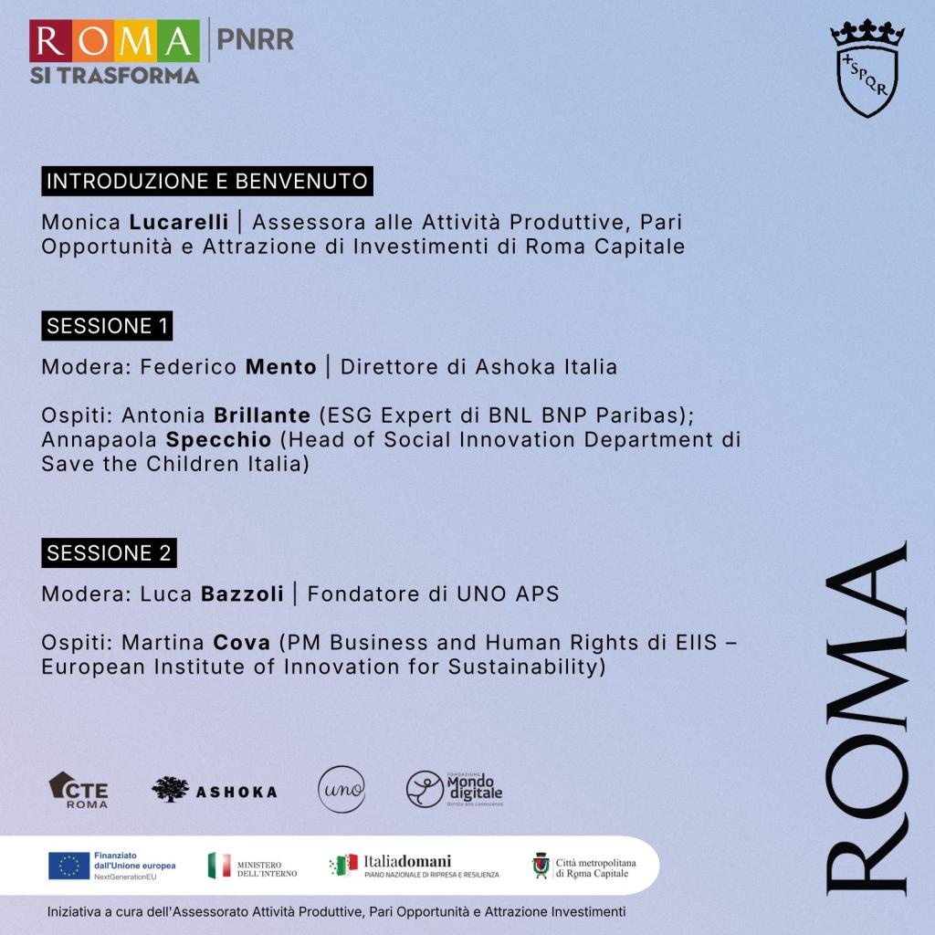 L’iniziativa, promossa dall’Assessorato alle Attività Produttive, Pari Opportunità e Attrazione di Investimenti di Roma Capitale, guidato da Monica Lucarelli, si inserisce nel quadro degli interventi del PNRR ed è realizzata in collaborazione con Ashoka Italia, UNO Ecosistemi e Fondazione Mondo Digitale ETS .