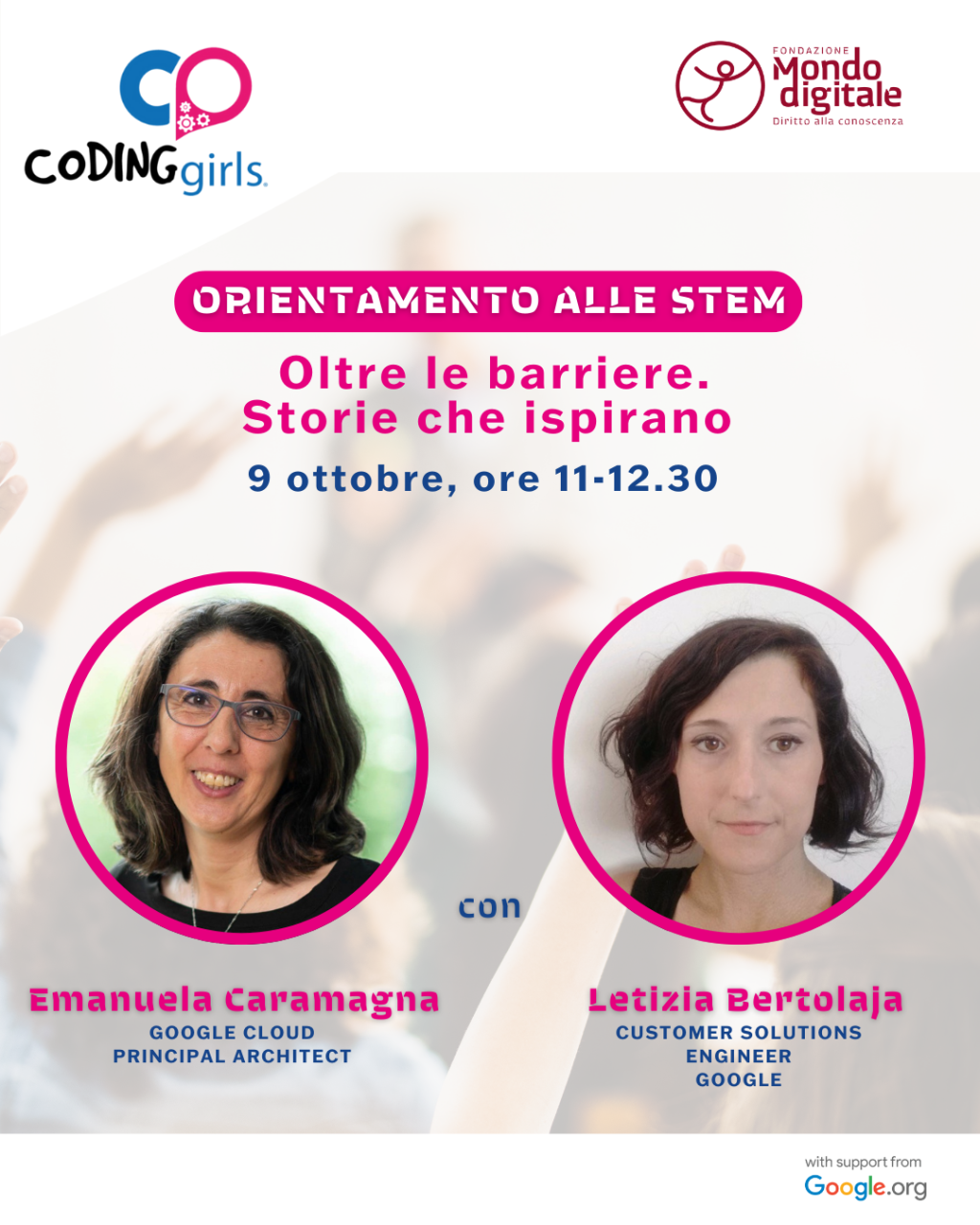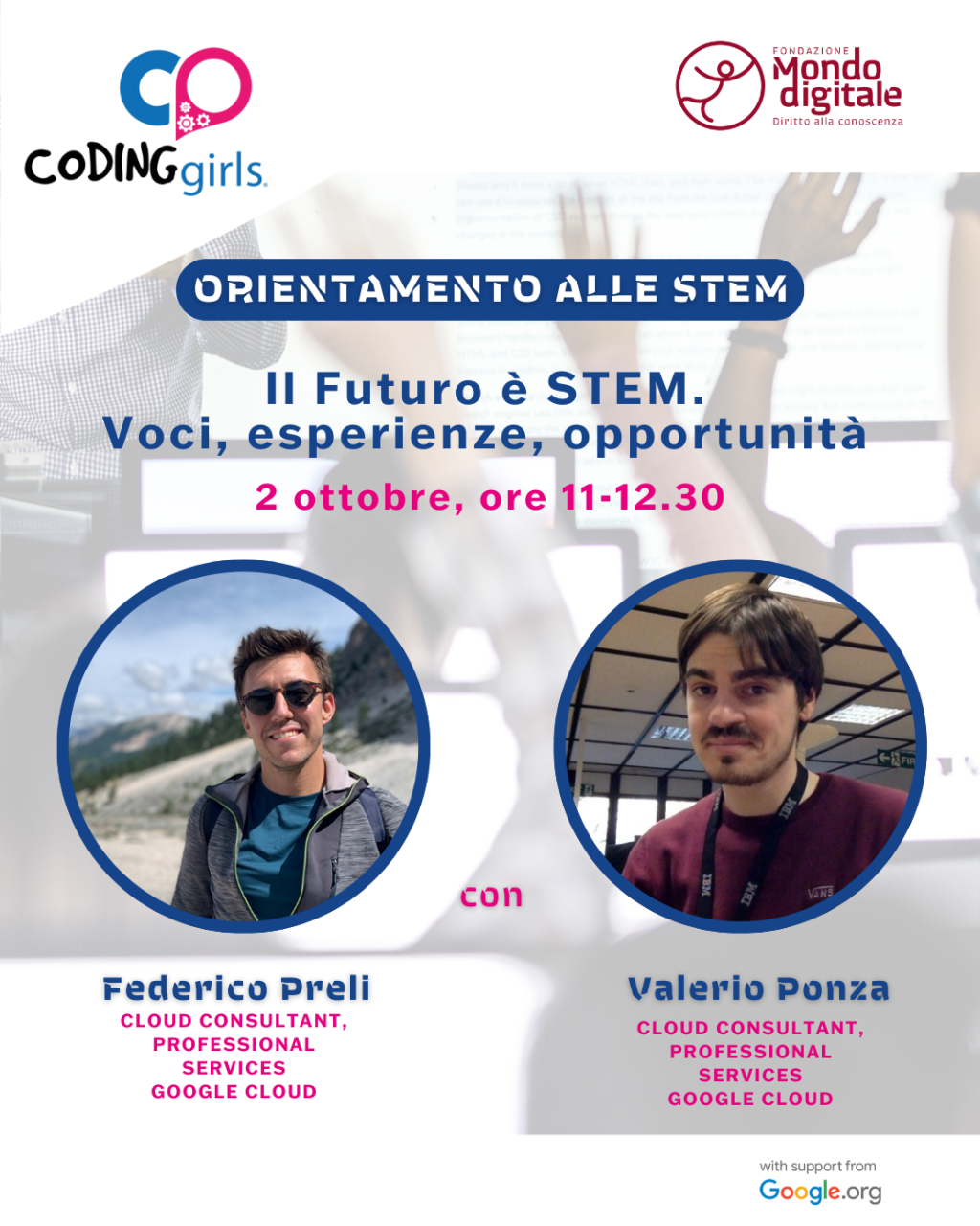 Gli appuntamenti conclusivi vedono protagonisti professionisti e professioniste di Google Cloud, che condividono il proprio percorso nel mondo STEM: passioni, sfide, opportunità e scelte coraggiose che hanno dato forma a solide carriere.
