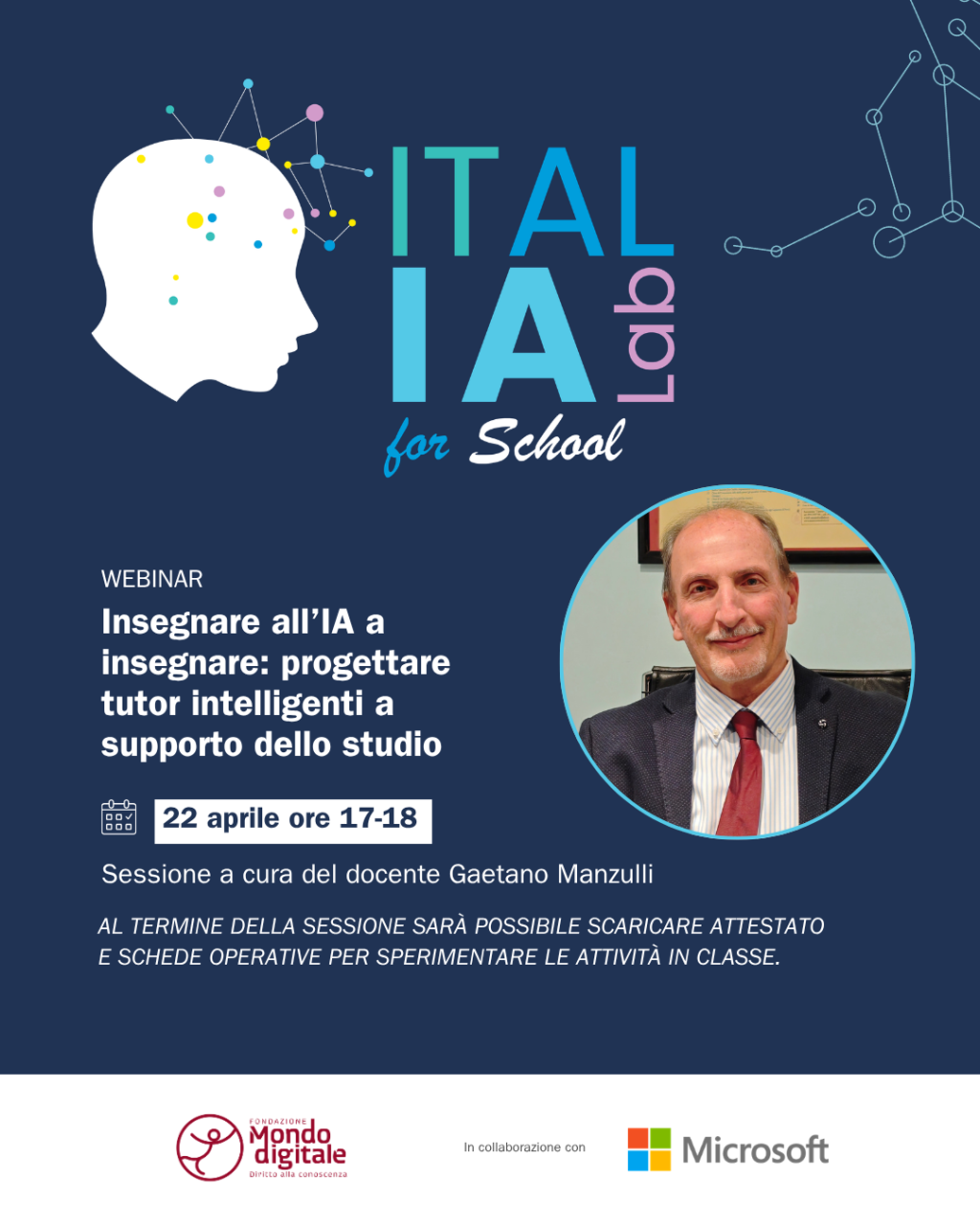 L’incontro, dal titolo Insegnare all’IA a insegnare: progettare tutor intelligenti a supporto dello studio, è in programma il 22 aprile, dalle 17 alle 18, ed è rivolto a docenti di ogni ordine e grado interessati a integrare l’IA nella didattica in modo consapevole e operativo.