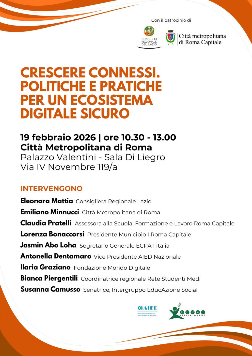 La Fondazione Mondo Digitale interviene al convegno Crescere Connessi. Politiche e pratiche per un ecosistema digitale sicuro, in programma il 19 febbraio alle ore 10.30, presso la Sala Di Liegro di Palazzo Valentini, Città Metropolitana di Roma.