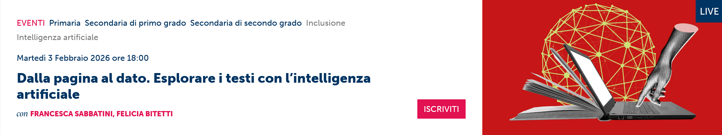 Entra nel vivo la collaborazione con Rizzoli Education, con il primo webinar in programma martedì 3 febbraio, alle ore 18. L’incontro, dal titolo “Dalla pagina al dato. Esplorare i testi con l’intelligenza artificiale” è dedicato all’esplorazione delle potenzialità dell’IA nell’analisi dei testi e nei processi di insegnamento e apprendimento. Il webinar, della durata di un’ora, vede la partecipazione di Francesca Sabbatini e Felicia Bitetti, e segna l’avvio di un percorso condiviso che mette in dialogo innovazione didattica, ricerca educativa e produzione editoriale.