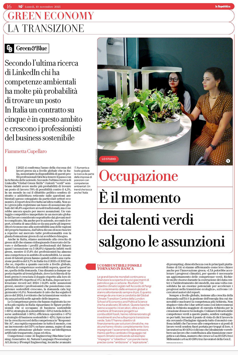 Il 2025 è l’anno della riscossa dei lavori green. Secondo l’ultimo Global Green Skills Report di LinkedIn, chi possiede competenze ambientali ha quasi il doppio delle probabilità di trovare lavoro rispetto ai profili tradizionali (8% contro 4,3%). In Italia un’assunzione su cinque (18,6%) riguarda ruoli legati alla sostenibilità e cresce del 3,7% la domanda di talenti “verdi”, in particolare nei settori del business sostenibile, della tutela delle risorse ambientali e della strategia di sostenibilità.