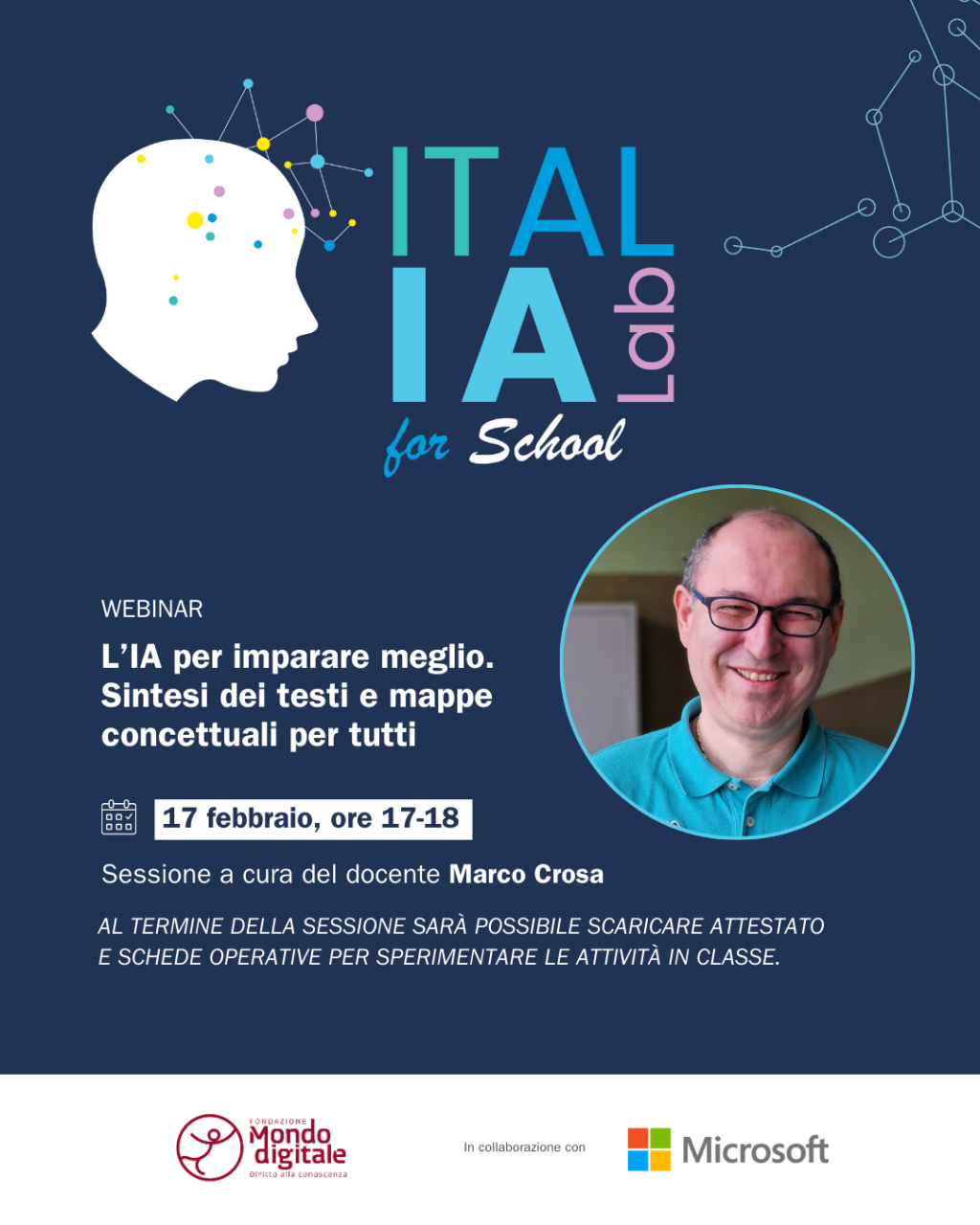 A queste domande risponde il nuovo webinar promosso nell’ambito di Ital.IA Lab for School, il programma di formazione che accompagna docenti e studenti nella comprensione critica e responsabile dell’intelligenza artificiale applicata alla didattica. L'appuntamento è online per il prossimo 17 febbraio, dalle 17 alle 18, sulla piattaforma Teams.