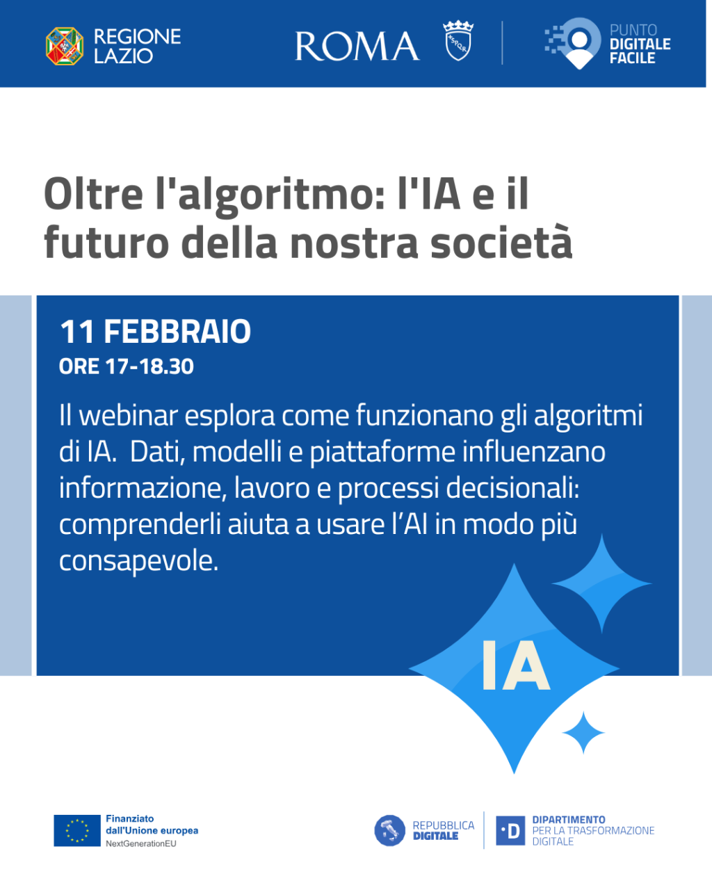 Il ciclo Oltre l’algoritmo rientra nelle attività di Terza Missione della Sapienza ed è parte del progetto Centri di Facilitazione Digitale, promosso dal Dipartimento Pianificazione Strategica e PNRR di Roma Capitale.
