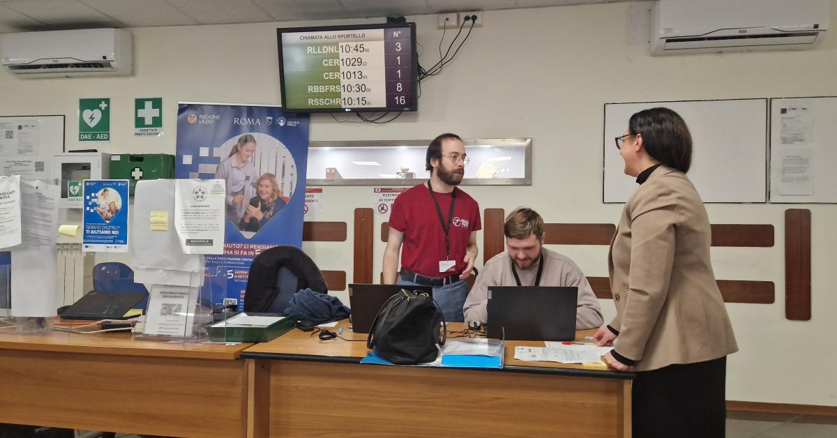 Gli uffici del IX Municipio si trovano in un complesso di appartamenti che attraversa viale Ignazio Silone, all’interno di un ponte accessibile dal controviale, accessibile attraverso due rampe di scale. La sensazione, accedendo al servizio anagrafe, è che ci si trovi un ambiente familiare, dove tutti si danno del tu. C’è già una buona confidenza tra le persone che arrivano e i nostri facilitatori Marco e Giovanni.