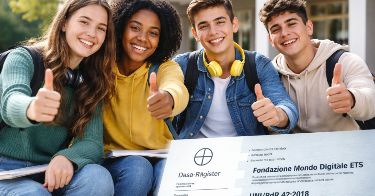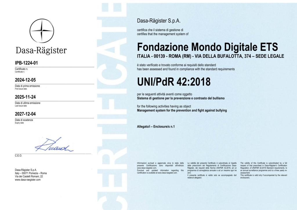 La Fondazione Mondo Digitale ETS ha ottenuto la certificazione UNI/PdR 42:2018 per il sistema di gestione dedicato alla prevenzione e al contrasto del bullismo e del cyberbullismo, rilasciata da Dasa-Rägister spa. Un risultato importante che conclude il percorso avviato nei mesi scorsi, già annunciato sul nostro sito, e che consolida l’impegno strutturato della Fondazione nella promozione di ambienti educativi sicuri, inclusivi e rispettosi, sia nei contesti scolastici sia nelle attività territoriali [vedi la notizia Politiche contro il bullismo e cyberbullismo].