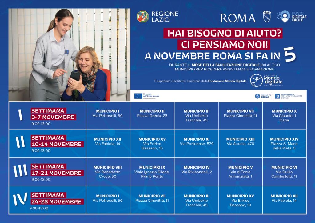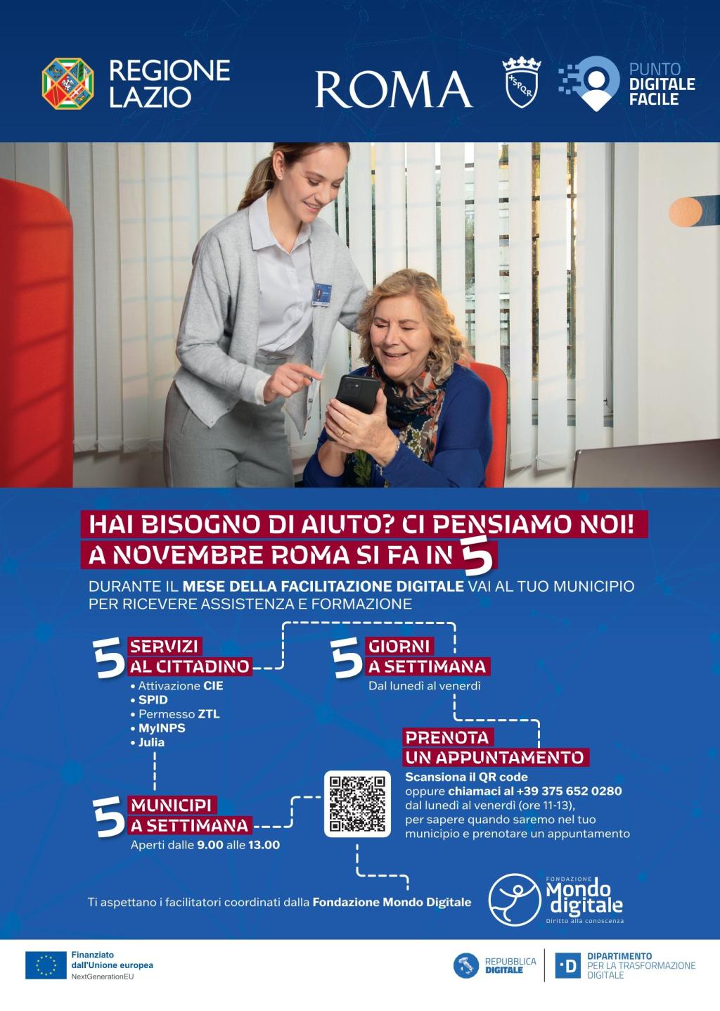 Cinque giorni a settimana, cinque municipi al giorno, cinque servizi essenziali per i cittadini. È la formula del mese della facilitazione digitale, l’iniziativa promossa da Roma Capitale con il coordinamento della Fondazione Mondo Digitale per accompagnare i romani nell’uso dei principali servizi online.