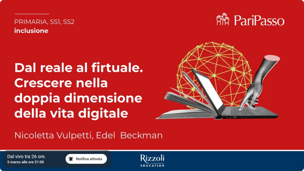 Come accompagnare bambini e ragazzi in una vita sempre più intrecciata tra dimensione fisica e digitale? È la domanda al centro del webinar Dal reale al virtuale. Crescere nella doppia dimensione della vita digitale, in programma giovedì 5 marzo alle ore 21, promosso da Rizzoli Education nell’ambito del progetto PariPasso e realizzato con il contributo della Fondazione Mondo Digitale.