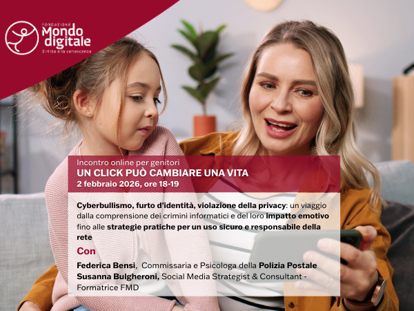 Lunedì prossimo 2 febbraio, dalle ore 18 alle 19, la Fondazione Mondo Digitale organizza il webinar “Un click può cambiare una vita”, un incontro formativo rivolto a genitori ed educatori per affrontare in modo consapevole e concreto i principali rischi del vivere digitale.