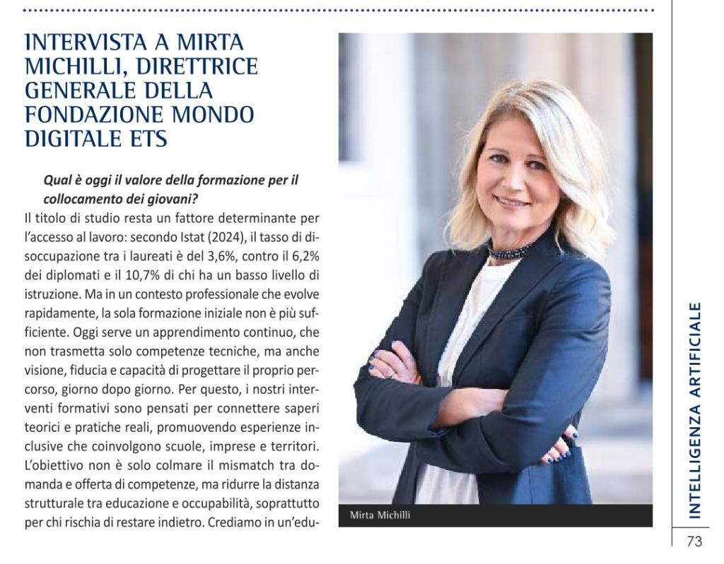 Nel numero 59 della rivista MicroFinanza è pubblicata una lunga intervista a Mirta Michilli, direttrice generale della Fondazione Mondo Digitale ETS, dal titolo Una tecnologia che include.