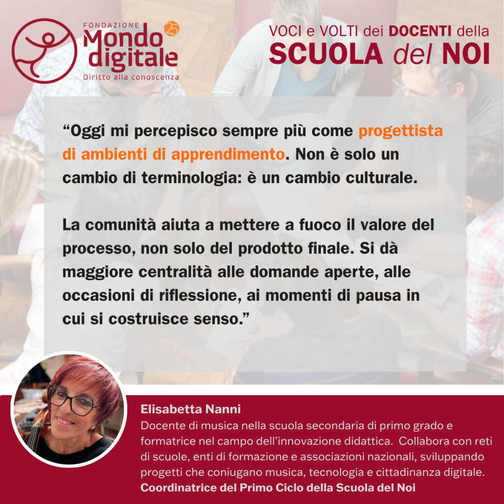 Ha reso più esplicita una trasformazione che probabilmente era già in atto dentro di me, ma che faticava a trovare le parole giuste. Oggi mi percepisco sempre più come progettista di ambienti di apprendimento. Non è solo un cambio di terminologia: è un cambio culturale. La comunità aiuta a mettere a fuoco il valore del processo, non solo del prodotto finale. Si dà maggiore centralità alle domande aperte, alle occasioni di riflessione, ai momenti di pausa in cui si costruisce senso. Questo cambia concretamente il modo di stare in classe: più ascolto, più apertura all'imprevisto, più intenzionalità nelle scelte metodologiche.