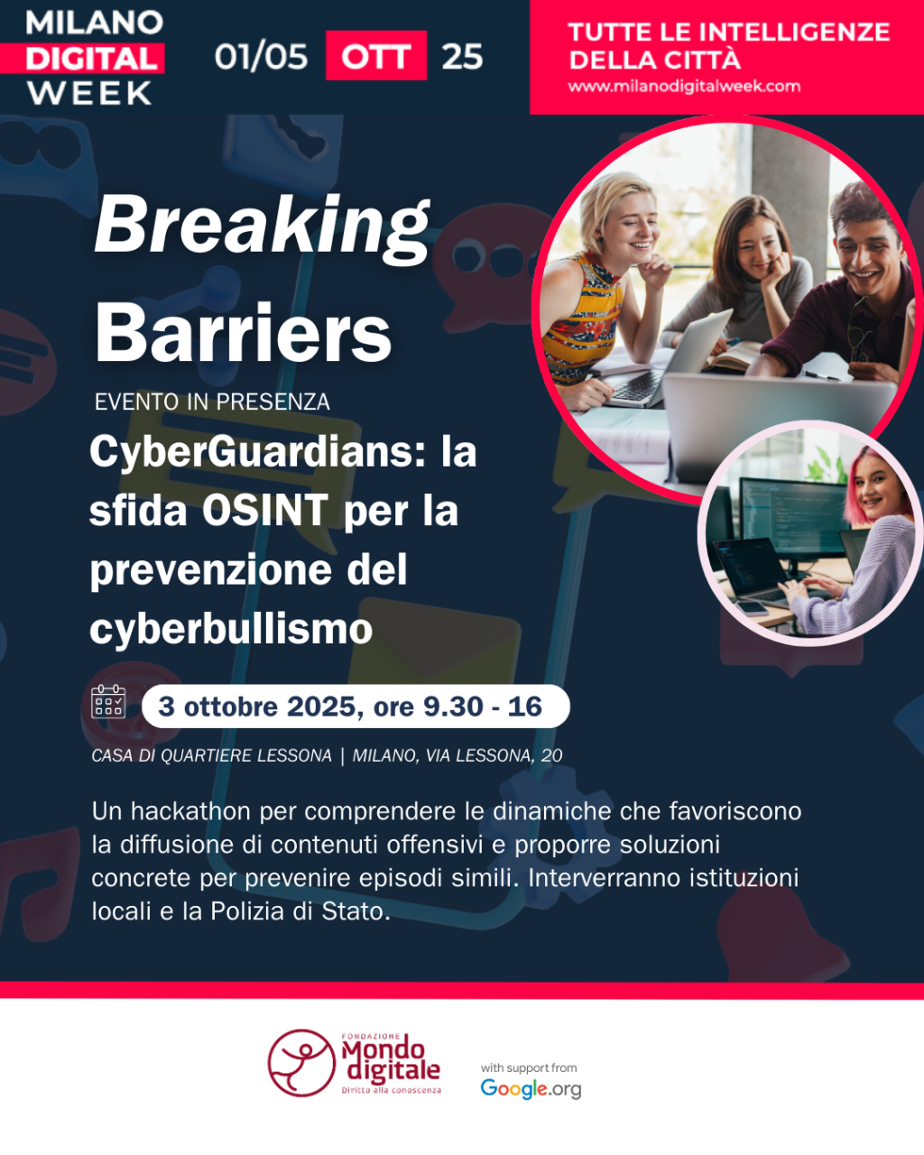 The Casa di Quartiere in Via Lessona, a historic meeting place for the citizens of the Quarto Oggiaro district in Milan, hosted the Milanese challenge of the Breaking Barriers: beyond barriers, STEM for all. Promoted by Fondazione Mondo Digitale ETS with the support of Google.org, the event is part of the Milan Digital Week programme. Around 110 secondary school students took part in an Osint Challenge entitled CyberGuardians, on the theme of preventing online bullying. The students attend the Leone XIII scientific high school, the Schiaparelli-Gramsci Institute and the Galdus vocational school (second, third and fourth years).