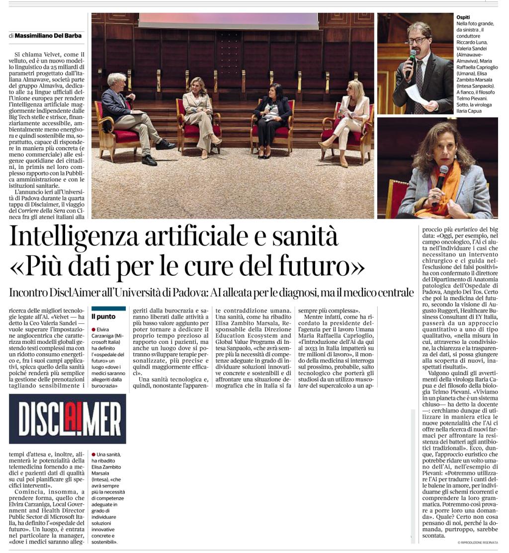Yesterday, Tuesday 14 October, the Fondazione Mondo Digitale participated as a knowledge partner in the fourth stage of the national tour DisclAImer. Last warnings before the revolution, promoted by Corriere della Sera in collaboration with Cineca and coordinated by Riccardo Luna. After Rome, Bologna and Naples, the debate arrived in Padua, a city symbolic of scientific and medical research, to address a crucial issue: “AI in the clinical setting. The power of multidisciplinarity”. The Foundation contributed by providing tools and experiences to promote the ethical, inclusive and educational use of artificial intelligence [see the news item DisclAImer in Padua].