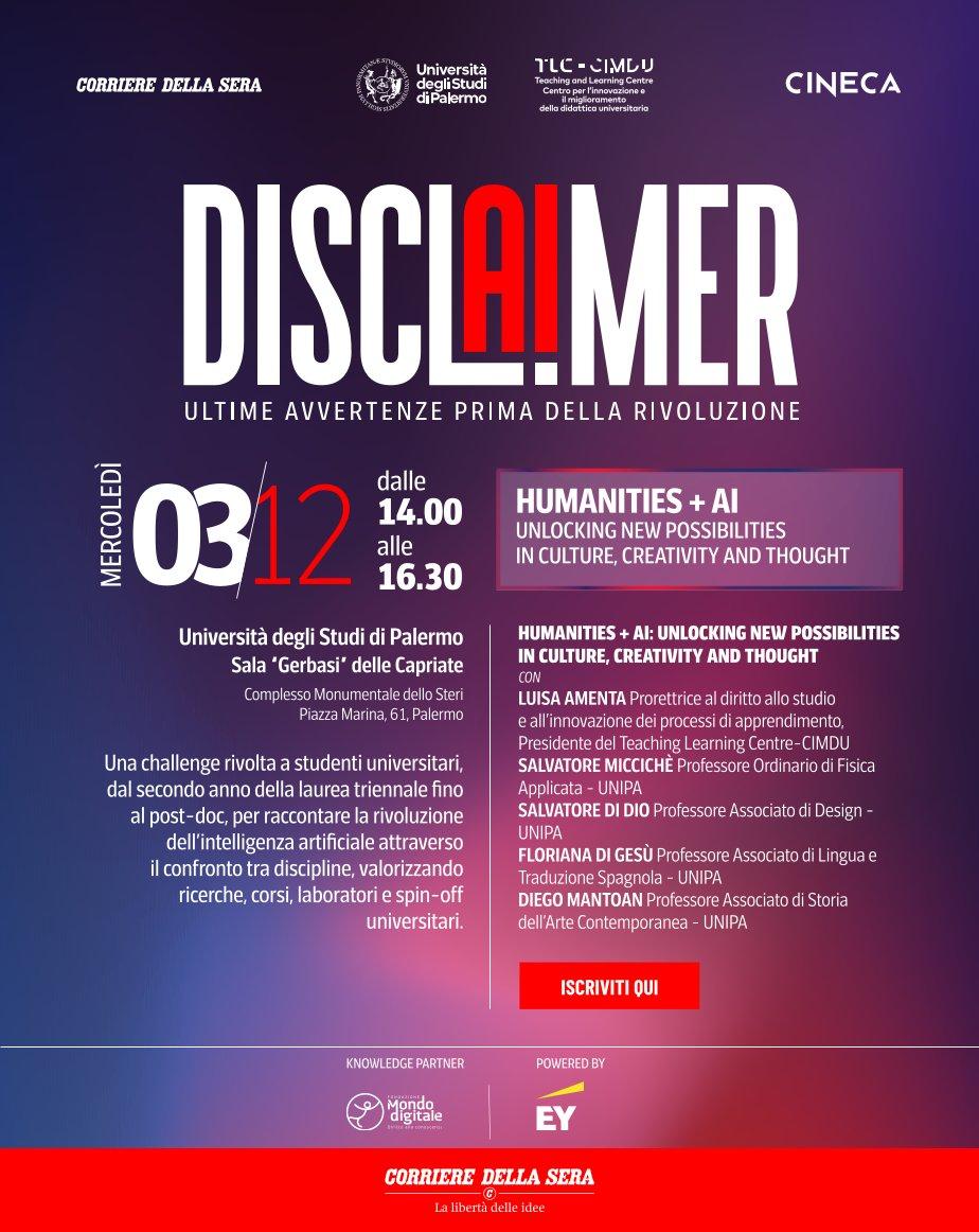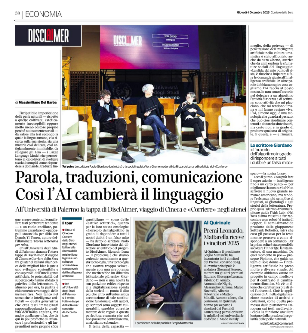 The eighth stage of DisclAImer. Final warnings before the revolution took place on 3 December at the University of Palermo, with a focus on the encounter between artificial intelligence and the humanities. Promoted by Corriere della Sera in collaboration with Cineca and Fondazione Mondo Digitale as knowledge partner, the event confirmed the role of the University of Palermo as a national reference point for Digital Humanities, thanks in part to the activities of the Artificial Intelligence & Robotics for Humanities Lab (AIRH) [see the news item Culture meets robots in Palermo].