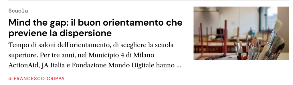 The magazine Vita.it has published an in-depth article on Mind the Gap, a project created by ActionAid Italia, Fondazione Mondo Digitale, Junior Achievement Italia and Comune di Milanoo to combat educational poverty and prevent early school leaving in Municipio 4 in Milan.