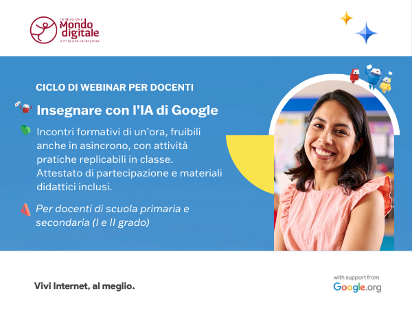 Prosegue Vivi Internet, al meglio (VIAM), il programma formativo promosso dalla Fondazione Mondo Digitale ETS con il supporto di Google.org, pensato per accompagnare docenti e studenti nello sviluppo di competenze di cittadinanza digitale, pensiero critico e uso consapevole delle tecnologie, con un’attenzione particolare all’intelligenza artificiale.