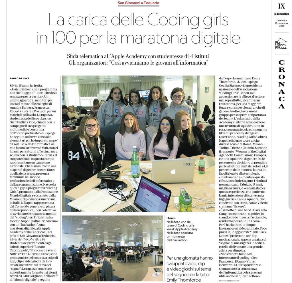 Dallo scorso 6 novembre l’associazione Coding Girls è in giro per l’Italia con un programma, promosso da Fondazione Mondo Digitale e Missione diplomatica USA in Italia in collaborazione con Microsoft, che vuole superare gli stereotipi di genere e avvicinare il mondo femminile alle STEAM. Oggi il tour nazionale ha fatto tappa a Napoli, presso l’Apple Developer Academy, con un hackathon che è appena giunto al termine.