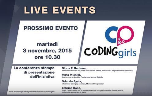 Oggi, martedì 3 novembre, alle 10.30, conferenza stampa di presentazione del progetto “Coding Girls” presso la sede dell’Ambasciata americana a Roma (sala Young, via Sallustiana 49).