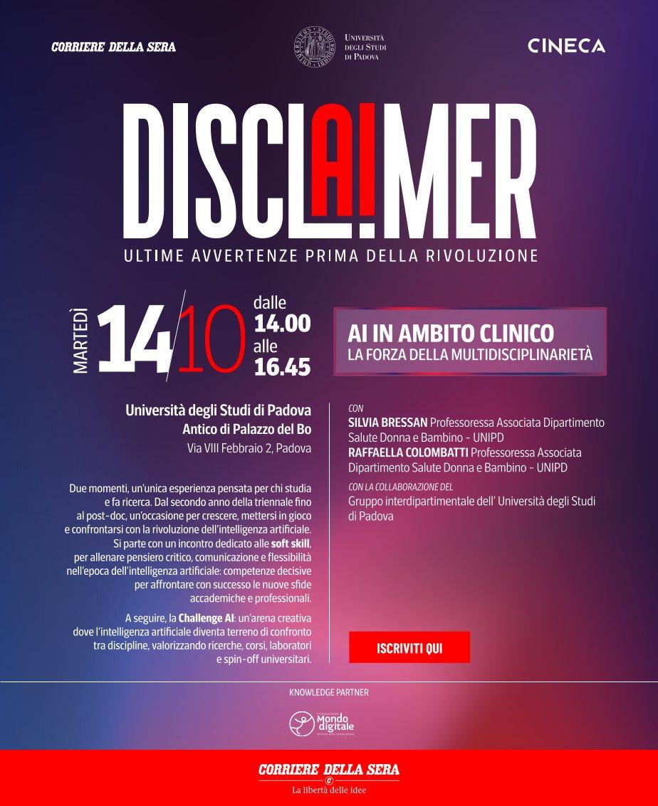 Oggi, martedì 14 ottobre 2025, fa tappa a Padova il tour nazionale DisclAImer. Ultime avvertenze prima della rivoluzione, promosso dal Corriere della Sera in collaborazione con Cineca e coordinato da Riccardo Luna, editorialista ed esperto di innovazione. La Fondazione Mondo Digitale partecipa come knowledge partner, portando esperienze e strumenti per un uso etico, inclusivo e formativo dell’intelligenza artificiale.