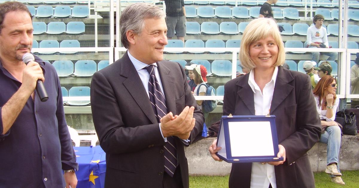 A consegnare la targa di riconoscimento al direttore della Fondazione, Mirta Michilli, è il parlamentare Antonio Tajani.