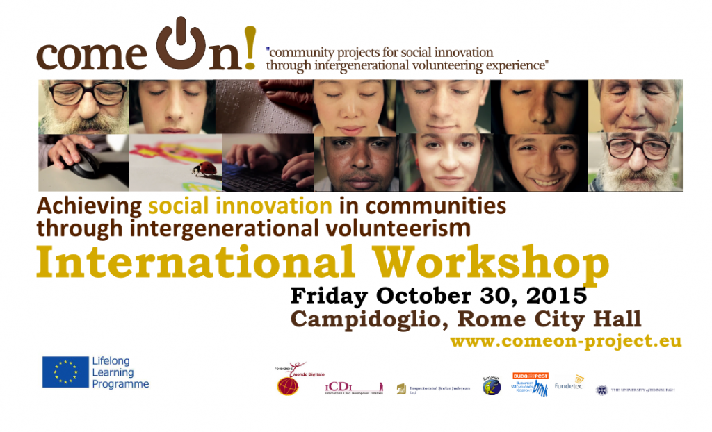 La Fondazione Mondo Digitale invita al workshop internazionale del progetto europeo ComeON! - Community projects for Social Innovation through intergenerational volunteering experiences che si terrà venerdì 30 ottobre nella Sala della Protomoteca in Campidoglio a Roma dalle 9 alle 12 nell’ambito dell’iniziativa Smart & Hearth Cities.