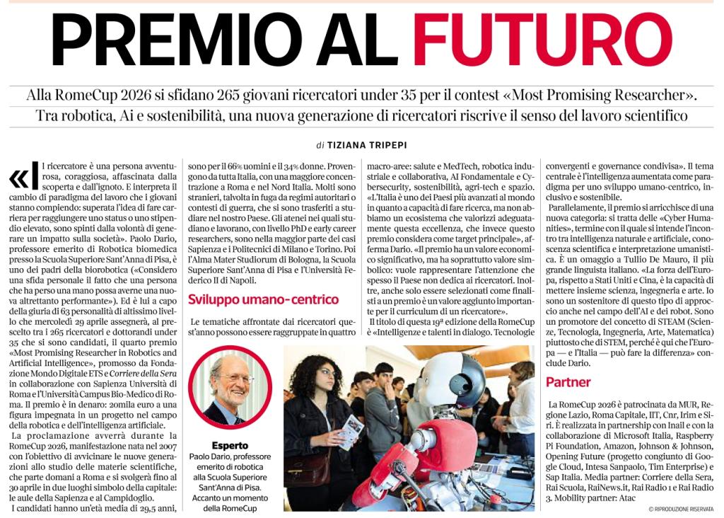 Selezionati tra 265 candidati provenienti da tutta Italia, i 13 finalisti del premio Most Promising Researcher in Robotics and Artificial Intelligence, rappresentano la punta di diamante di una nuova generazione di scienziati. Sottoposti al vaglio di una giuria di 63 esperti presieduta dal professore Paolo Dario, questi giovani talenti competono per un premio di 20.000 euro che riconosce rigore scientifico, innovazione e impatto sociale [vedi la notizia Research Award, al lavoro una giuria ampia e qualificata].