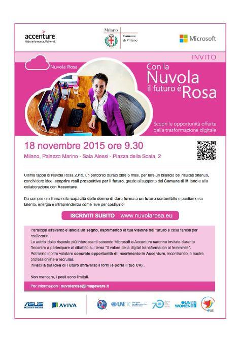 L’evento “Con la Nuvola il futuro è rosa”, realizzato grazie a Comune di Milano e Accenture, non è solo occasione per fare il bilancio delle attività svolte, ma è anche una nuova opportunità per guardare al futuro: alle ragazze viene infatti offerta una concreta possibilità di inserimento in azienda, a testimonianza di un impegno costante nei confronti delle giovani donne a cui l’intero progetto è stato dedicato.