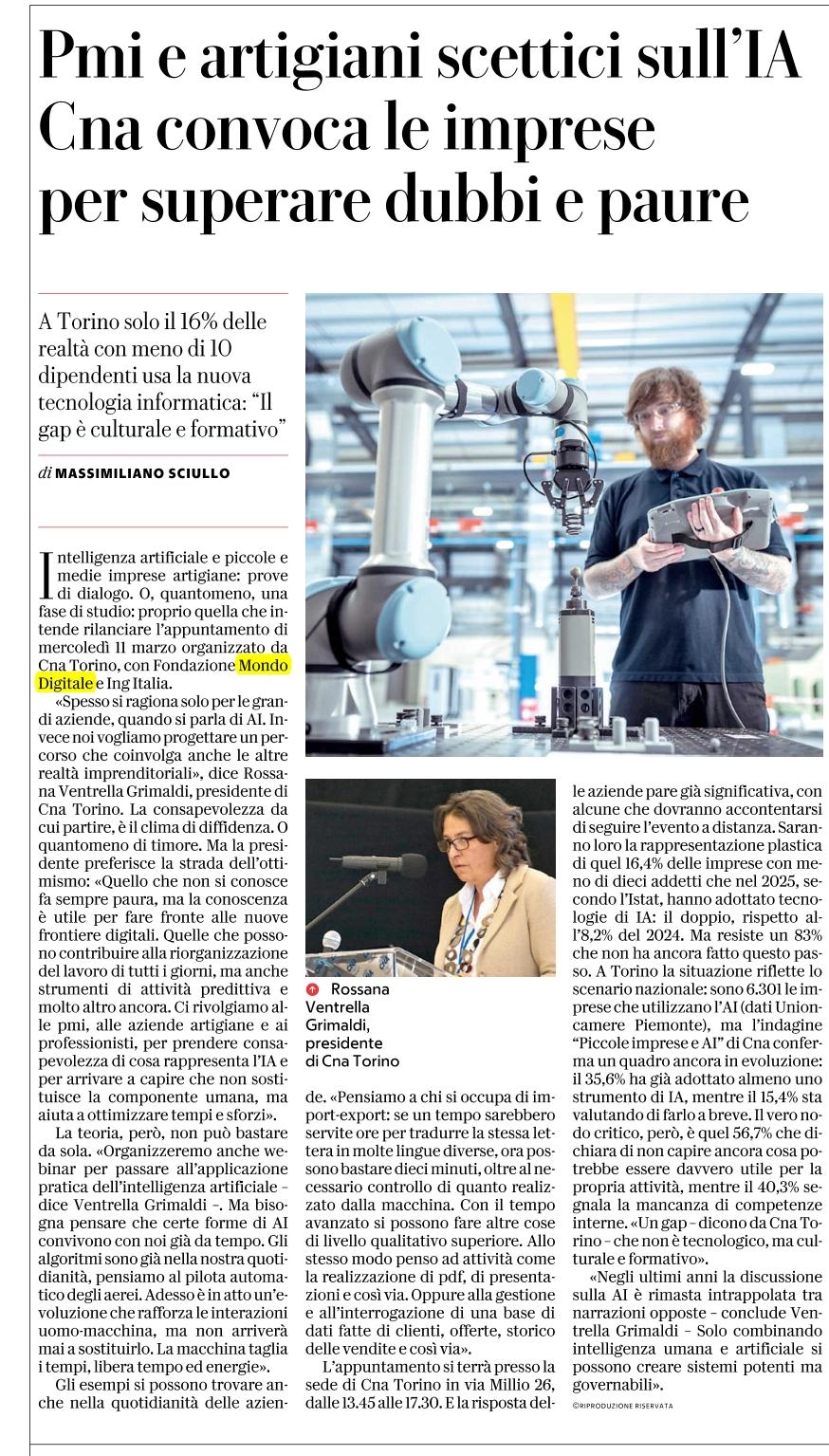 Ma la formazione non si ferma con l’evento di Torino: i partecipanti potranno approfondire i temi trattati con un ciclo di tre webinar gratuiti: “Intelligenza artificiale per imprese e professionisti: dalle basi all’applicazione nei processi di lavoro”. Tre appuntamenti online - il 18, 24 e 31 marzo 2026 - per un percorso progressivo: dalle fondamenta dell’IA generativa al prompting avanzato, fino alla creazione guidata di un primo agente AI.
