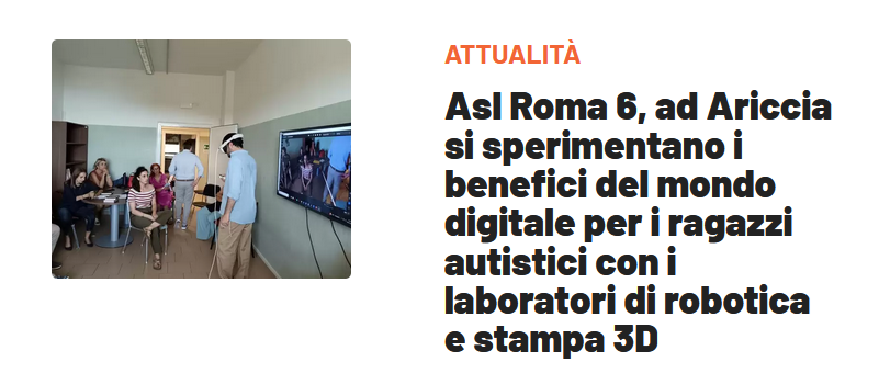 La redazione di Castelli Notizie ci aggiorna sullo stato di avanzamento dell’iniziativa nata dall’incontro con il progetto Vagone FMD. Da 01 a 100 nel Metaverso e dall’operazione “Headset donation program” di Meta che prevede la donazione con la formula “comodato d’uso” dei Meta Quest 2 ad alcune istituzioni e scuole italiane. Lo spunto è un aggiornamento pubblicato sul sito dell'azienda sanitaria: Asl Roma 6, Ariccia. I benefici del mondo digitale per i ragazzi autistici: l’esperienza rivoluzionaria dei laboratori di robotica e stampa 3D.