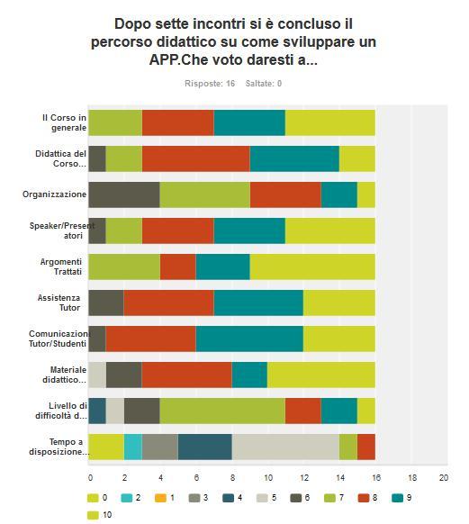 In sei incontri i professionisti della community DotNetCode.it hanno reso i ragazzi in grado di progettare e realizzare applicazioni per dispositivi mobili. Al termine del corso gli studenti hanno risposto a un questionario on line, per verificare il successo del percorso formativo. Basta un colpo d’occhio al grafico per rendersi conto delle valutazioni molto positive sull’esperienza. Terminata la formazione i ragazzi si sono messi subito al lavoro.