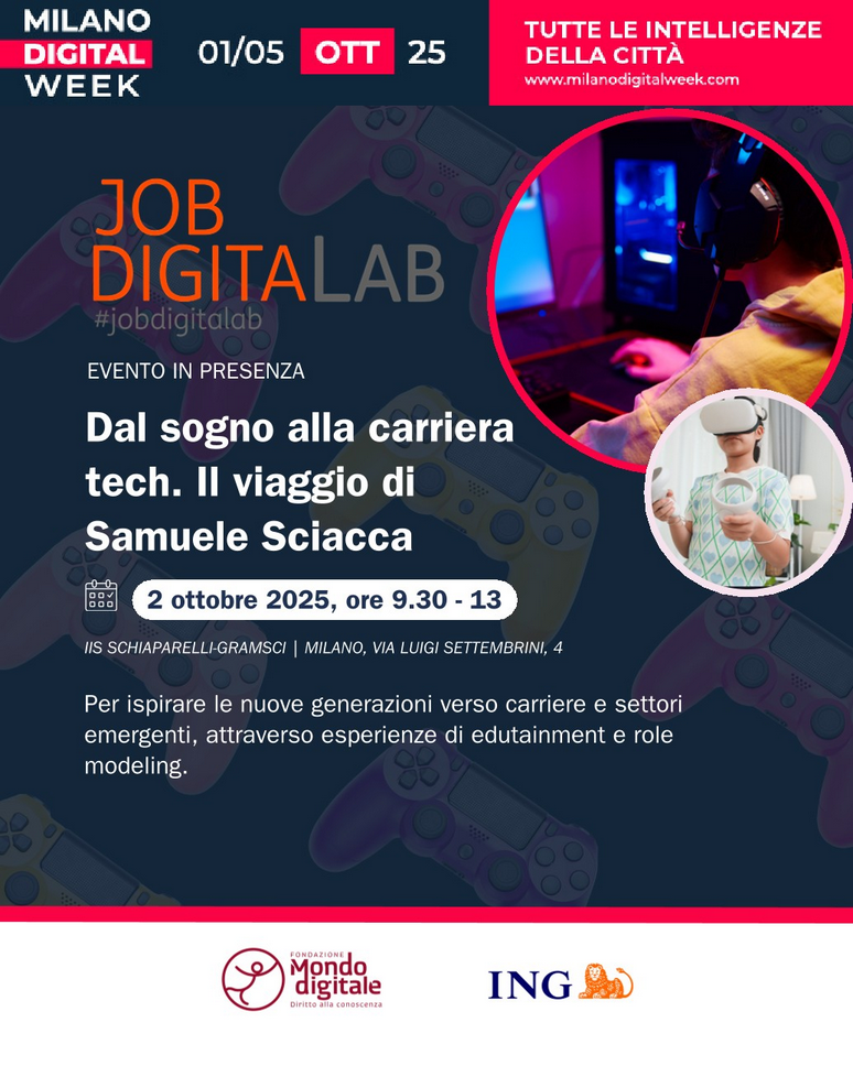 Fondazione Mondo Digitale e ING Italia partecipano alla Milano Digital Week con il primo evento formativo della sesta edizione di Job Digital Lab, il programma che ha già formato oltre 38.000 persone con percorsi dedicati a tutte le età per sviluppare competenze digitali e trasversali per il mondo del lavoro.