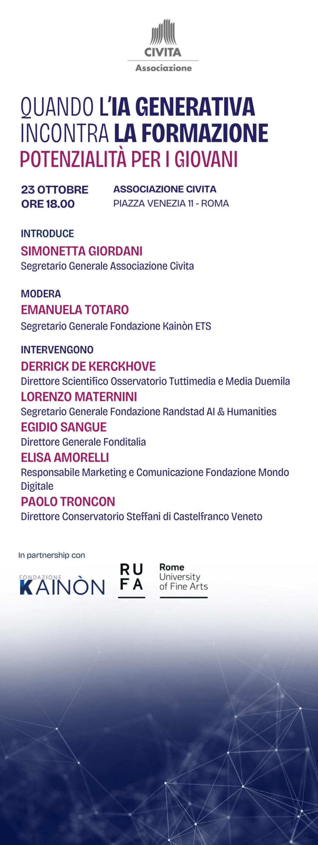 Sono alcune delle domande al centro dell’incontro “Quando l’IA Generativa incontra la formazione: potenzialità per i giovani”, in programma giovedì 23 ottobre alle ore 18 presso la sede dell’Associazione Civita (piazza Venezia 11, Roma). L’iniziativa si inserisce nel ciclo di appuntamenti promossi da Associazione Civita in collaborazione con Fondazione Kainòn ETS e Rome University of Fine Arts (Rufa), ispirati al XV Rapporto Civita Next Gen AI.