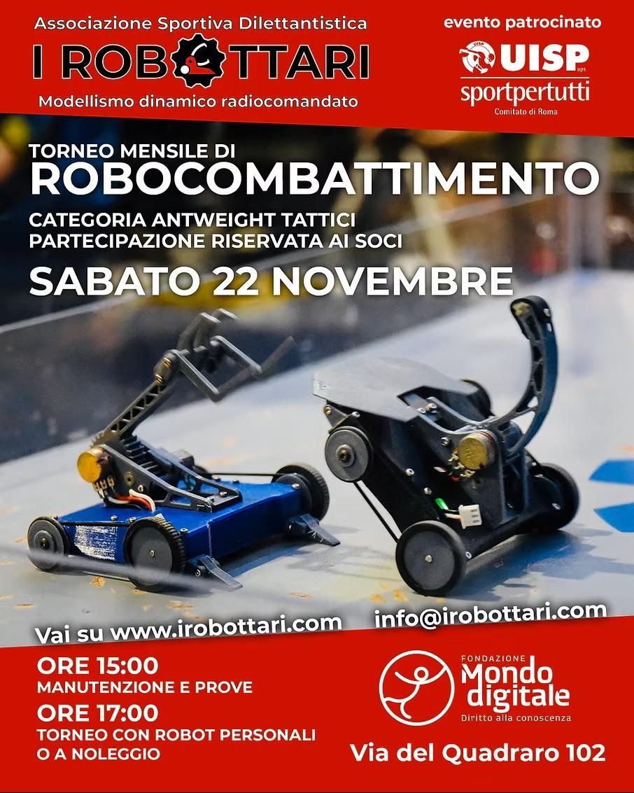 Il robocombattimento (Robot Combat) è uno sport internazionale, molto radicato negli Stati Uniti e nel Regno Unito e ormai diffuso in numerosi Paesi. Proprio come nel pugilato, esistono categorie diverse in base al peso dei robot. I format televisivi più noti - Robot Wars e BattleBots - hanno reso celebri le categorie pesanti, con robot da oltre 100 chili. Per far crescere la disciplina anche in Italia, l’associazione ha scelto di partire dagli Antweight, i “pesi formica” da 150 grammi, già ampiamente praticati oltremanica: compatti, accessibili da costruire e perfetti per avvicinare nuovi maker a questa speciale combinazione di tecnica, creatività e competizione.