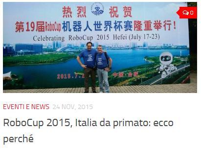 Navigando il sito di Officine Robotiche troviamo un post che ci cattura subito: RoboCup 2015, Italia da primato: ecco perché. Lo firma il presidente Guido Ottaviani (ricordate? A casa Ottaviani la robotica è “un affare di famiglia”).
