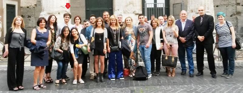 Nella foto Nicola (indicato dalla freccia rossa) con la community FMD davanti al Tempio di Adriano in attesa della diretta di Repubblica Tv, per il programma Innovation Game condotto dal digital champion Riccardo Luna.