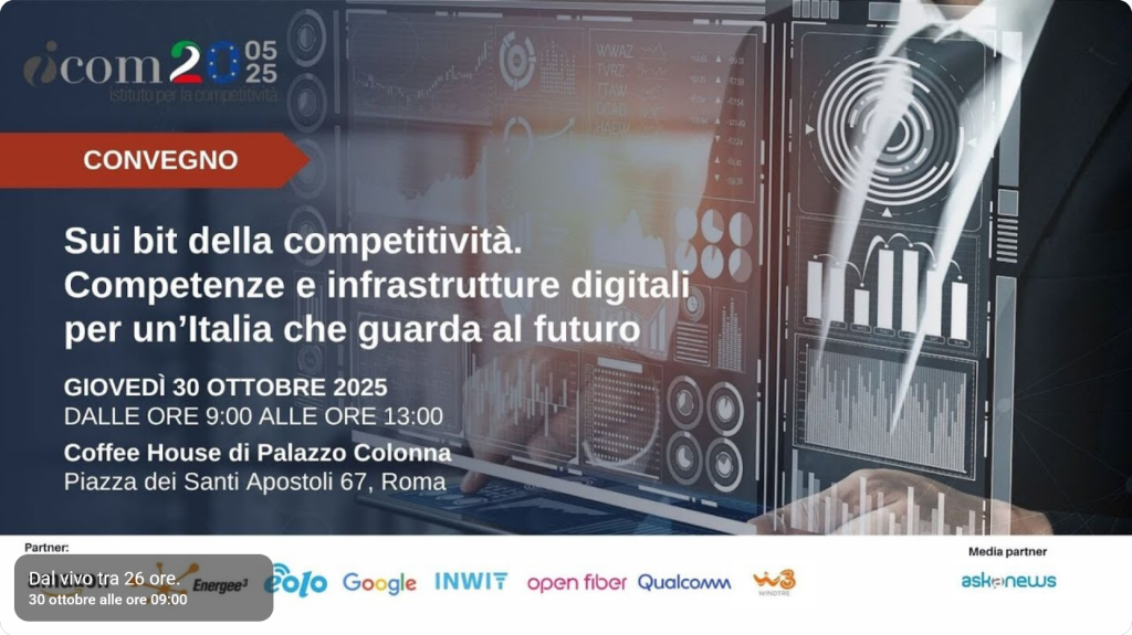 Domani, giovedì 30 ottobre, alla Coffee House di Palazzo Colonna (Piazza dei Santi Apostoli 67, Roma), si tiene il convegno pubblico Sui bit della competitività. Competenze e infrastrutture digitali per un’Italia che guarda al futuro, organizzato da Istituto per la Competitività (I-Com) in collaborazione con Ores. Osservatorio su Reti e Servizi di nuova generazione.